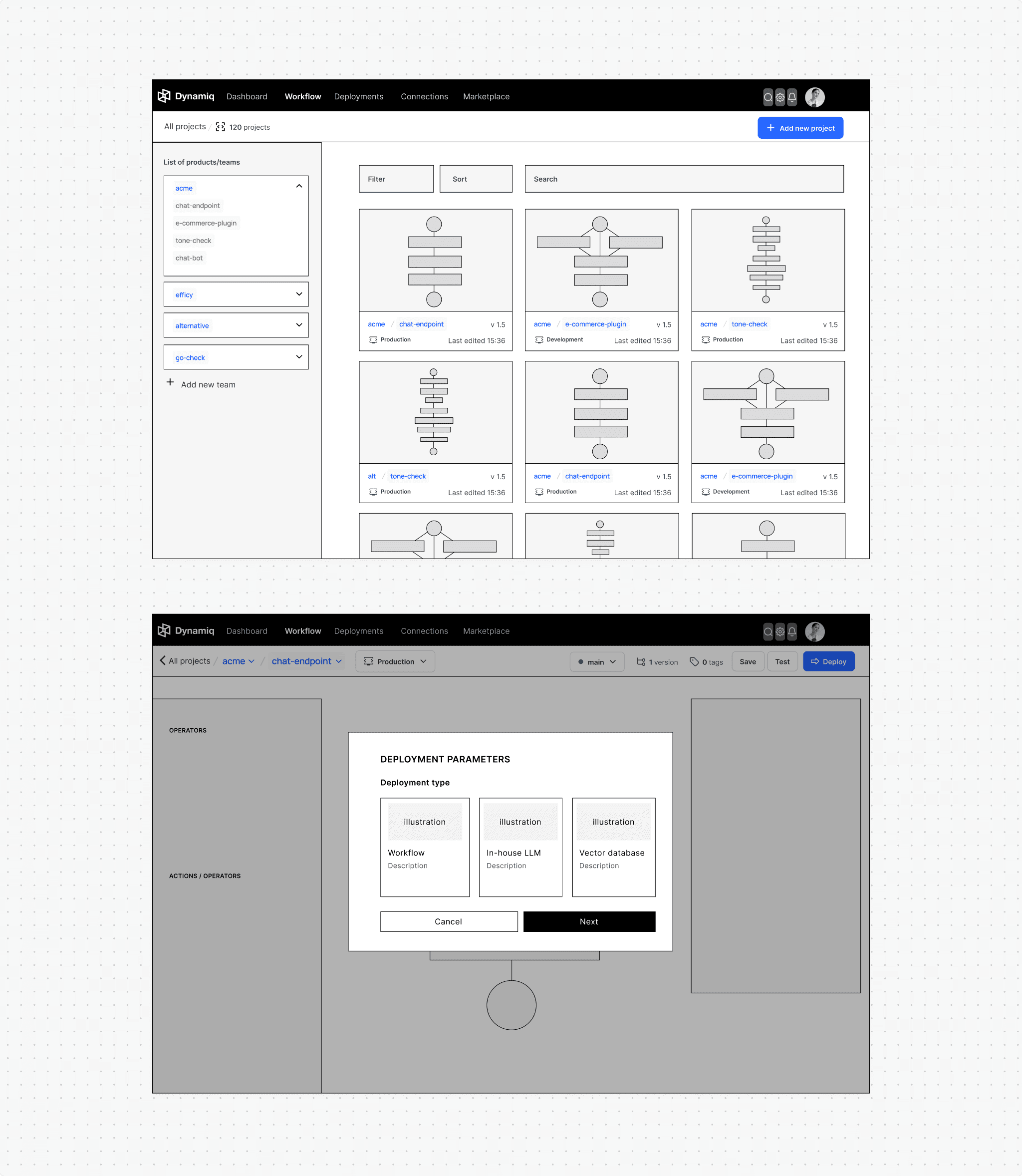 I developed wireframes focused on simplifying complex tasks such as workflow creation and deployment. Through multiple iterations, I refined the layouts to help users move effortlessly between workflows, metrics, and AI interactions. These wireframes served as the foundation for an intuitive interface that reduces the learning curve for non-technical users while remaining flexible and scalable for advanced use cases.