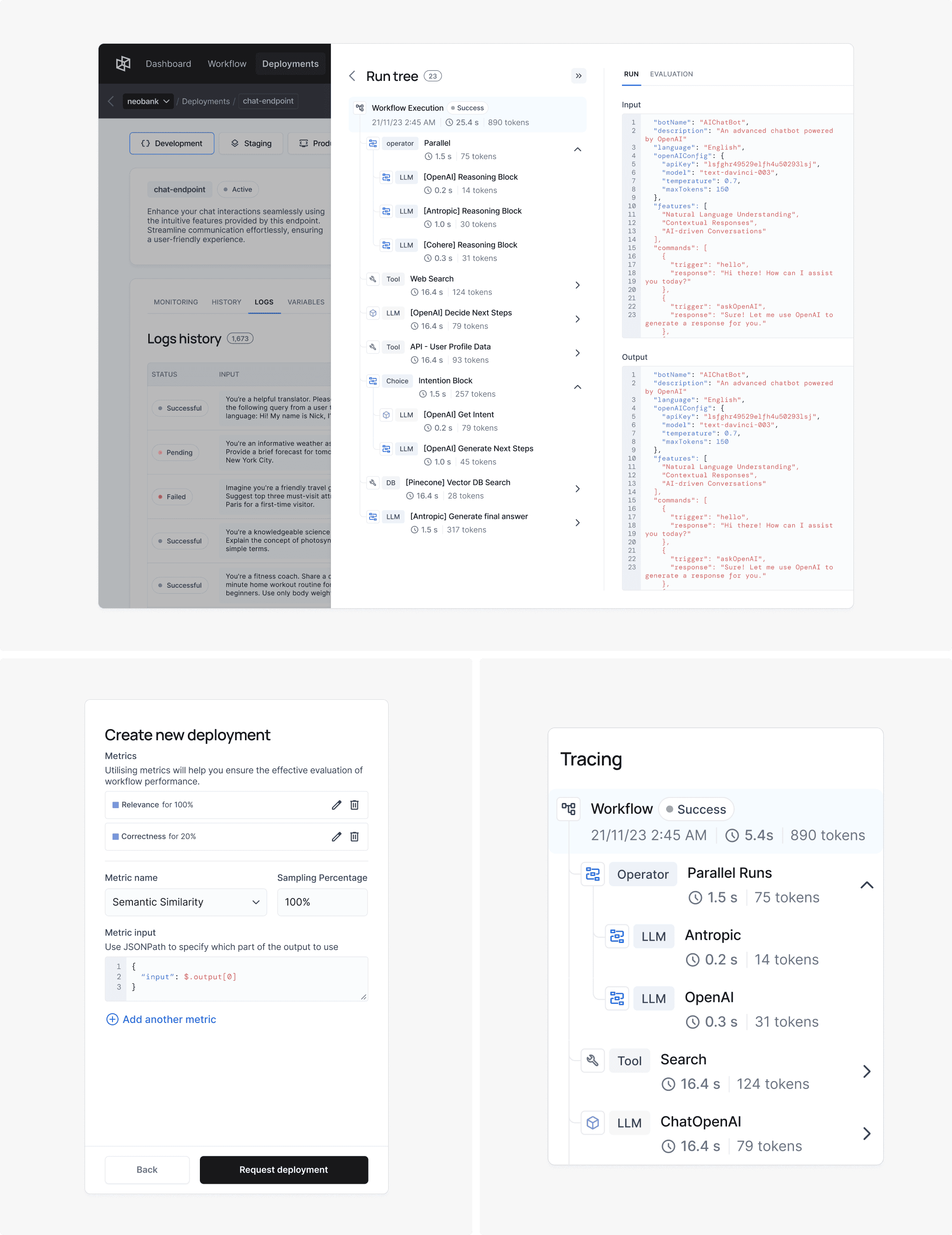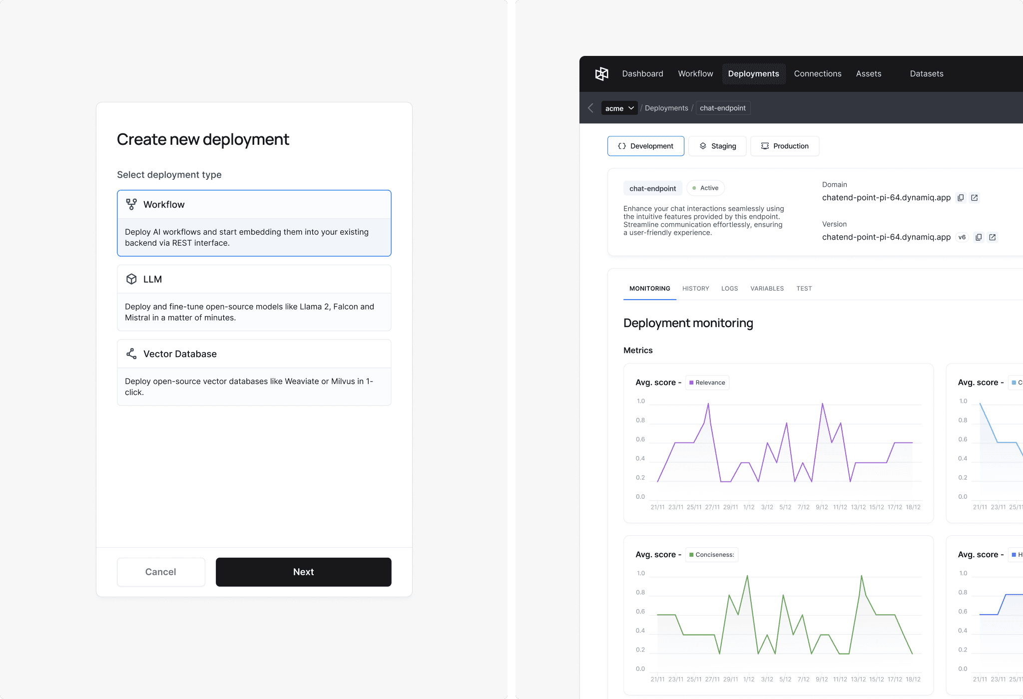 AI workflow deployment is managed through a straightforward interface that guides users from development to production. Key metrics - such as performance and efficiency - are clearly surfaced, with real-time monitoring to support informed decision-making. The deployment experience is designed to be accessible, providing a clear and confident path from initial setup to final output.
