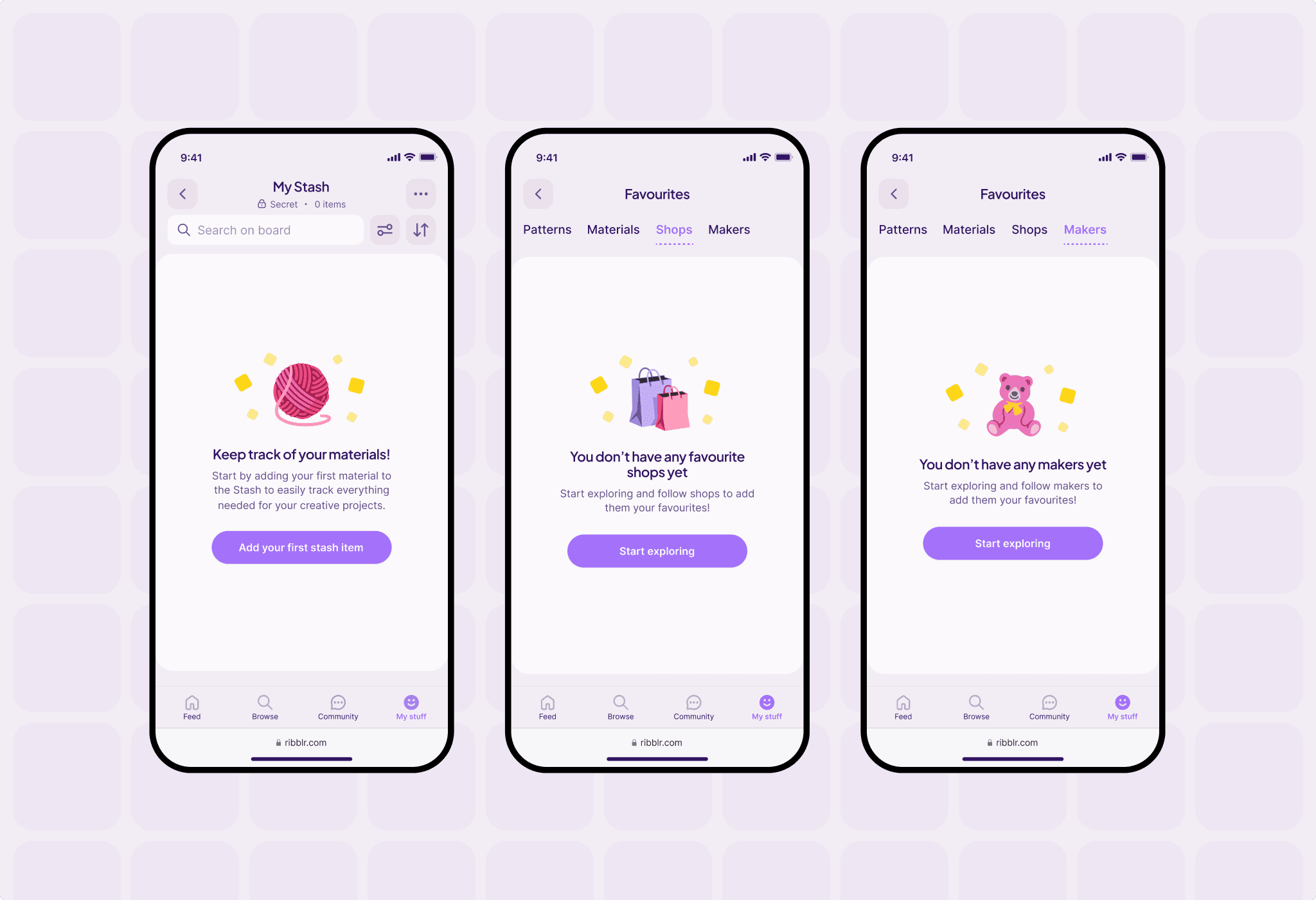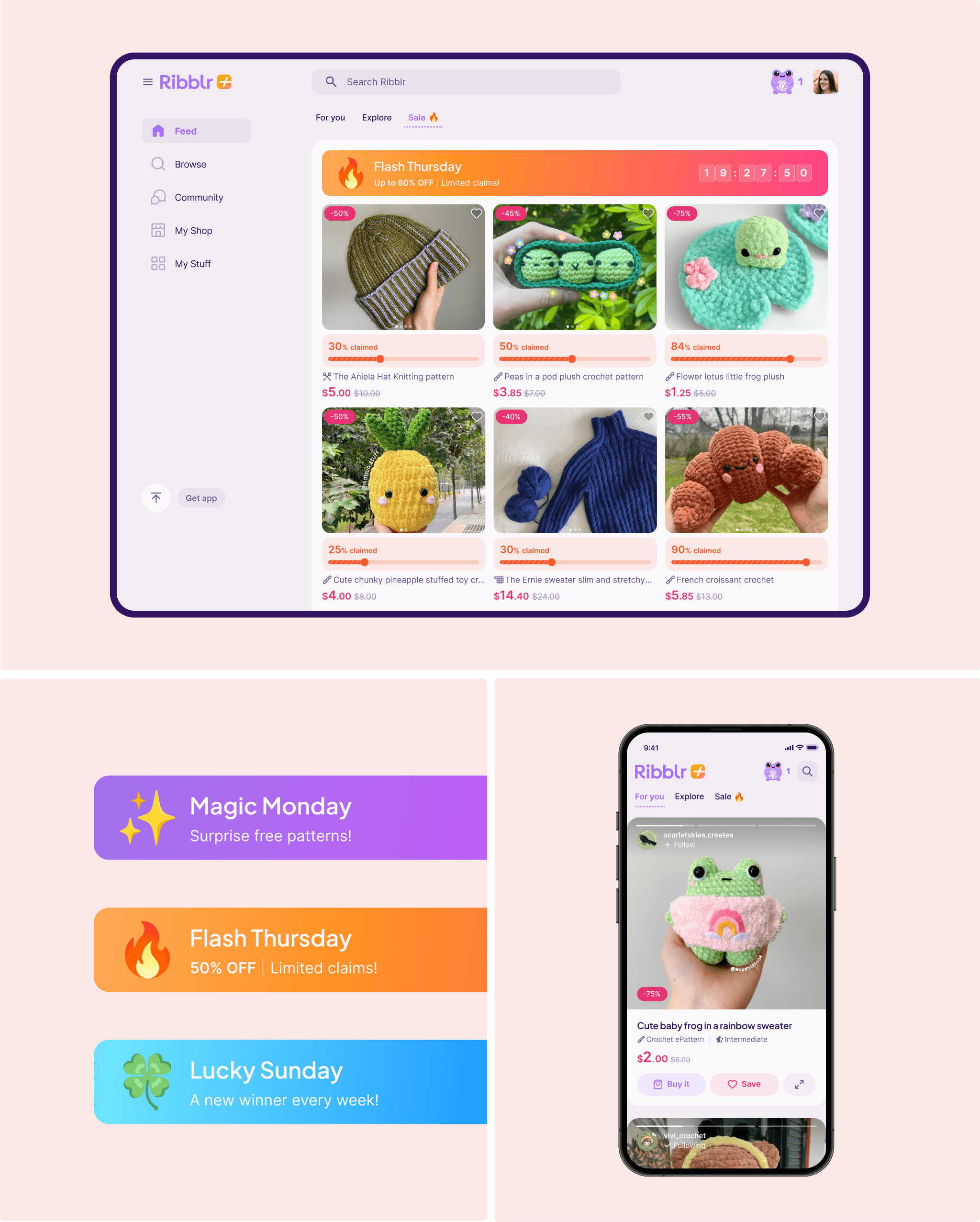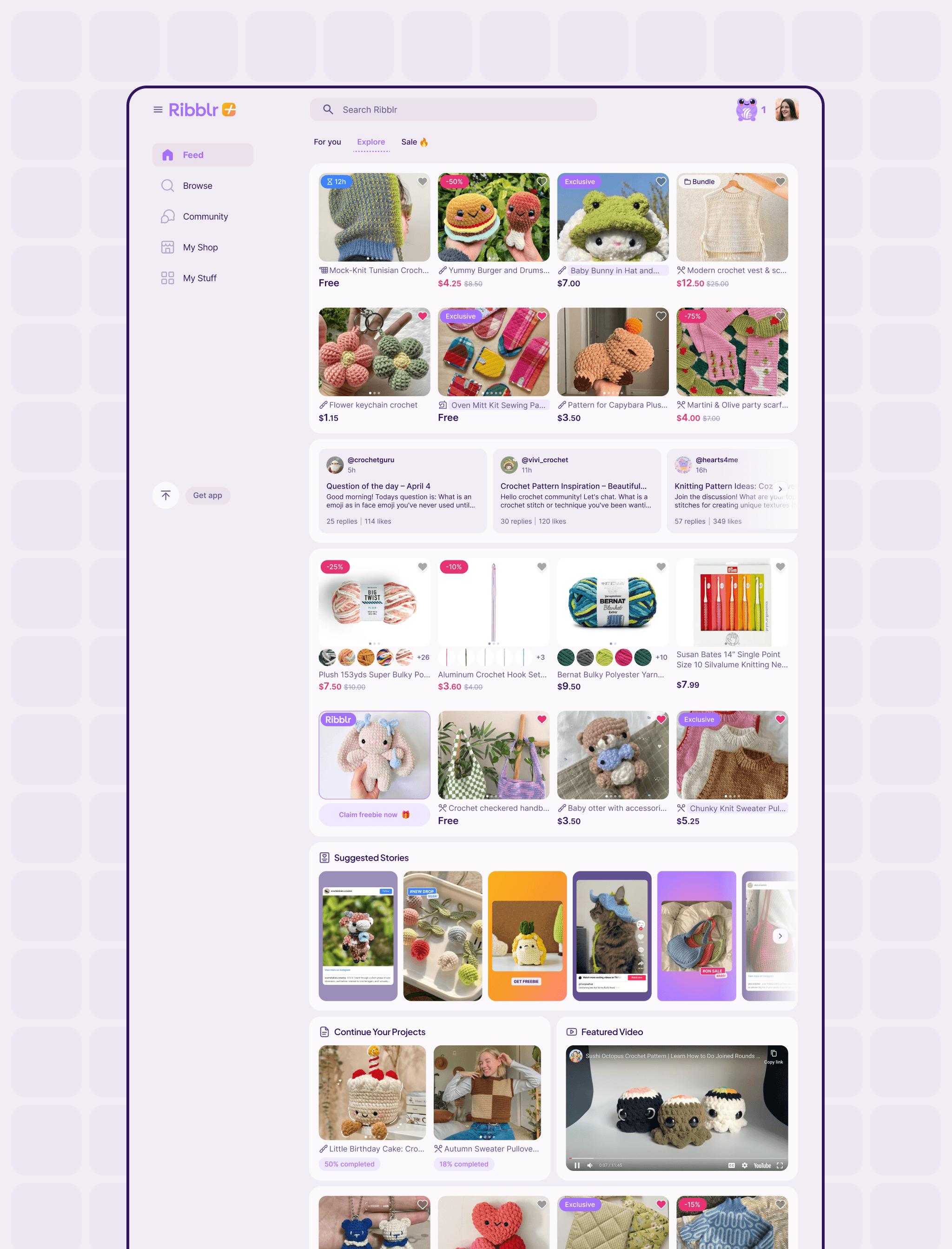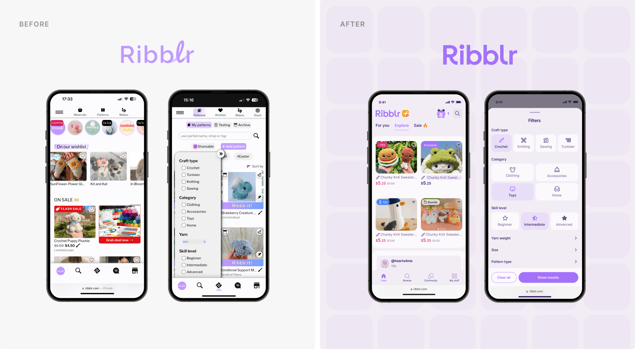 Challenges: Ribblr had built a highly engaged crafting community supported by a fast-moving product team that regularly shipped new features in response to user needs. Over time, this organic growth resulted in a wide and complex feature set, creating opportunities to improve clarity and overall usability. As the platform scaled, refining navigation, strengthening UI consistency, and creating a more intuitive, visually cohesive experience became essential—particularly for onboarding new users.