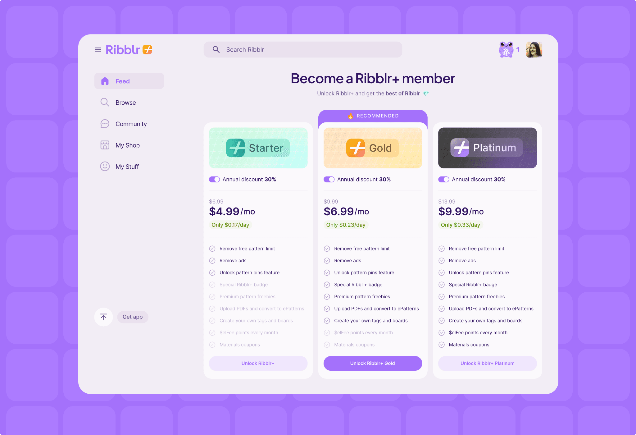 A structured membership page was designed to present Ribblr+ subscription tiers - Starter, Gold, and Platinum - in a clear and engaging way. Feature comparisons and a strong visual hierarchy help users quickly understand differences and choose the plan that best fits their needs.