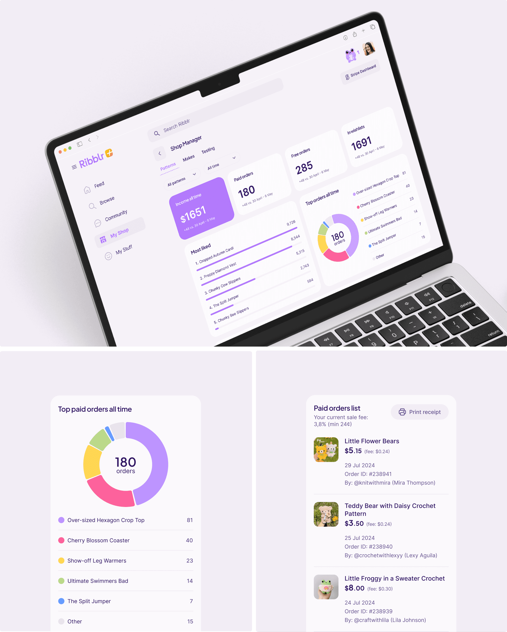 Ribblr already provided advanced shop metrics, but the experience was refined to surface insights more clearly. The redesigned dashboard highlights key data - such as income, wishlist counts, and top-performing items—making it easier for shop owners to track performance and make informed decisions.