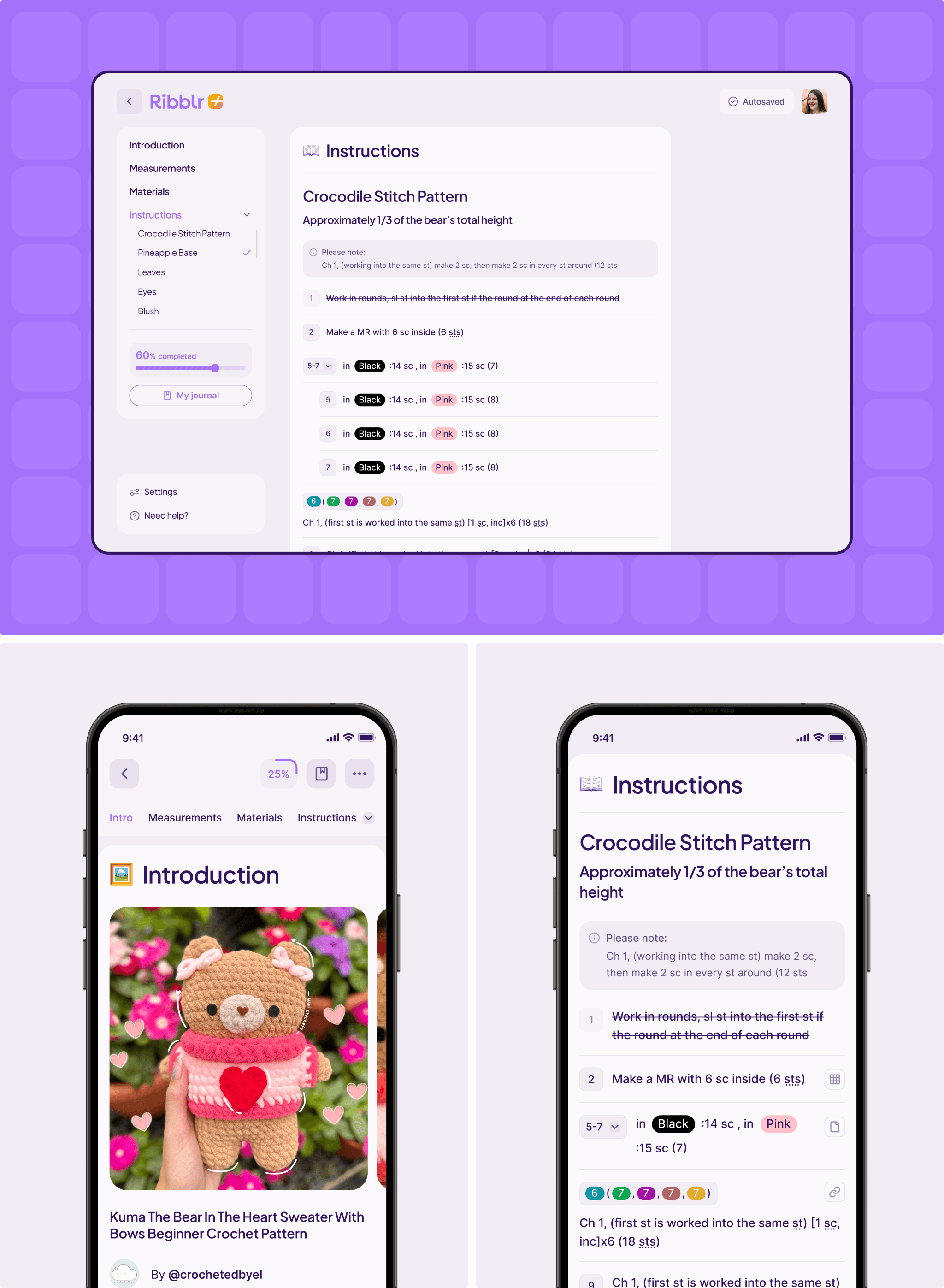 Ribblr’s interactive patterns were already a key differentiator, offering a dynamic alternative to static PDFs. The focus of the redesign was to refine the UX of this experience — improving navigation, progress tracking, and visual clarity to make the step-by-step journey smoother and more engaging.